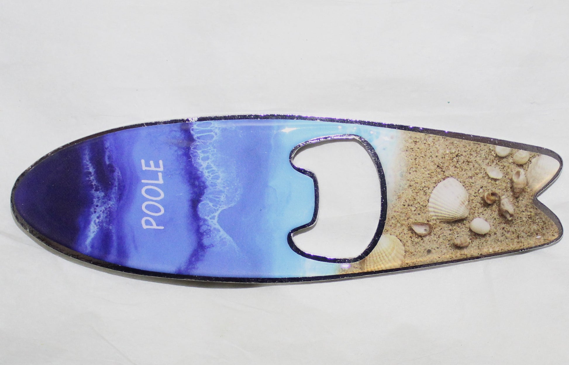 Commemorate a visit to Poole Quay with an eye-catching magnet, featuring vivid colours and a lovely beach design and surfboard shape. Combining form and function this magnet can decorate a fridge, hold up photos and papers, or open bottles.