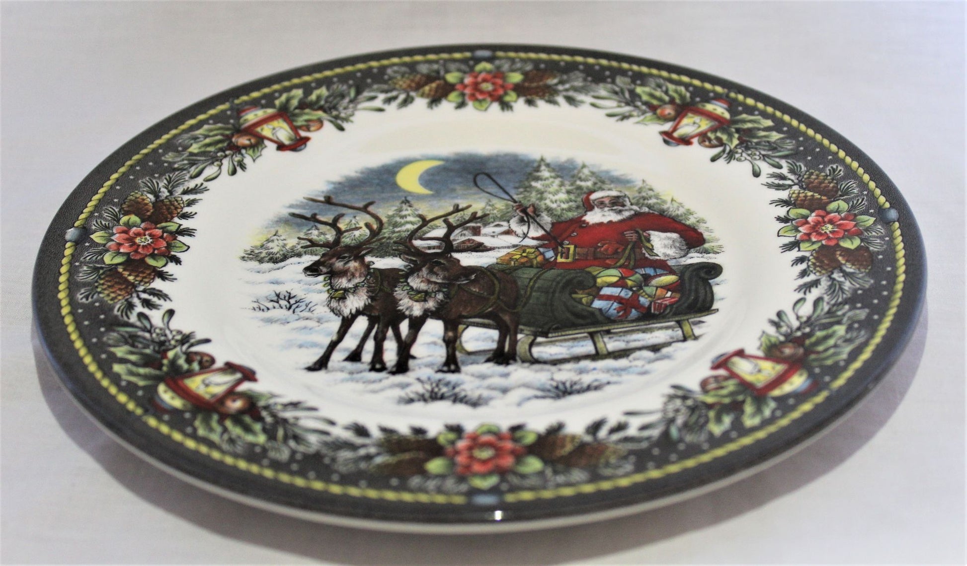 A lovely side plate decorated with a festive Christmas scene of Santa Claus, hard at work delivering presents.